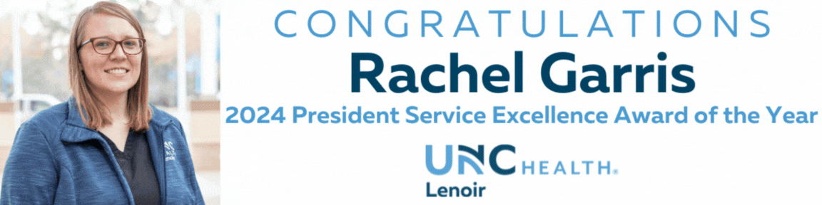 UNC Health Lenoir is pleased to announce that Rachel Garris has been named the 2024 President’s Service Excellence Award (PSEA) of the year winner. Awarded annually, the PSEA of the year is presented to an employee selected by their peers who exemplifies superior performance, strong leadership, effective communication, and service excellence.