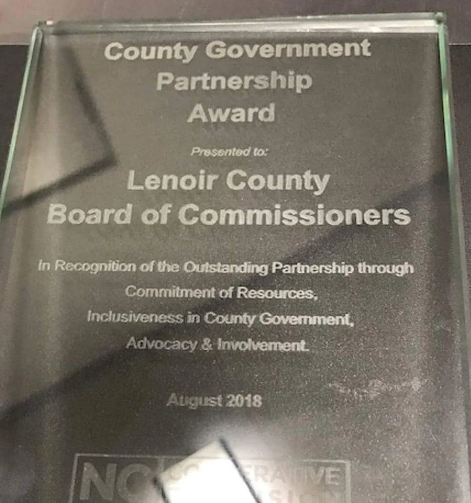 The award was presented to the Lenoir County Board of Commissioners In recognition of the outstanding partnership through the commitment of resources. and inclusiveness in county government.