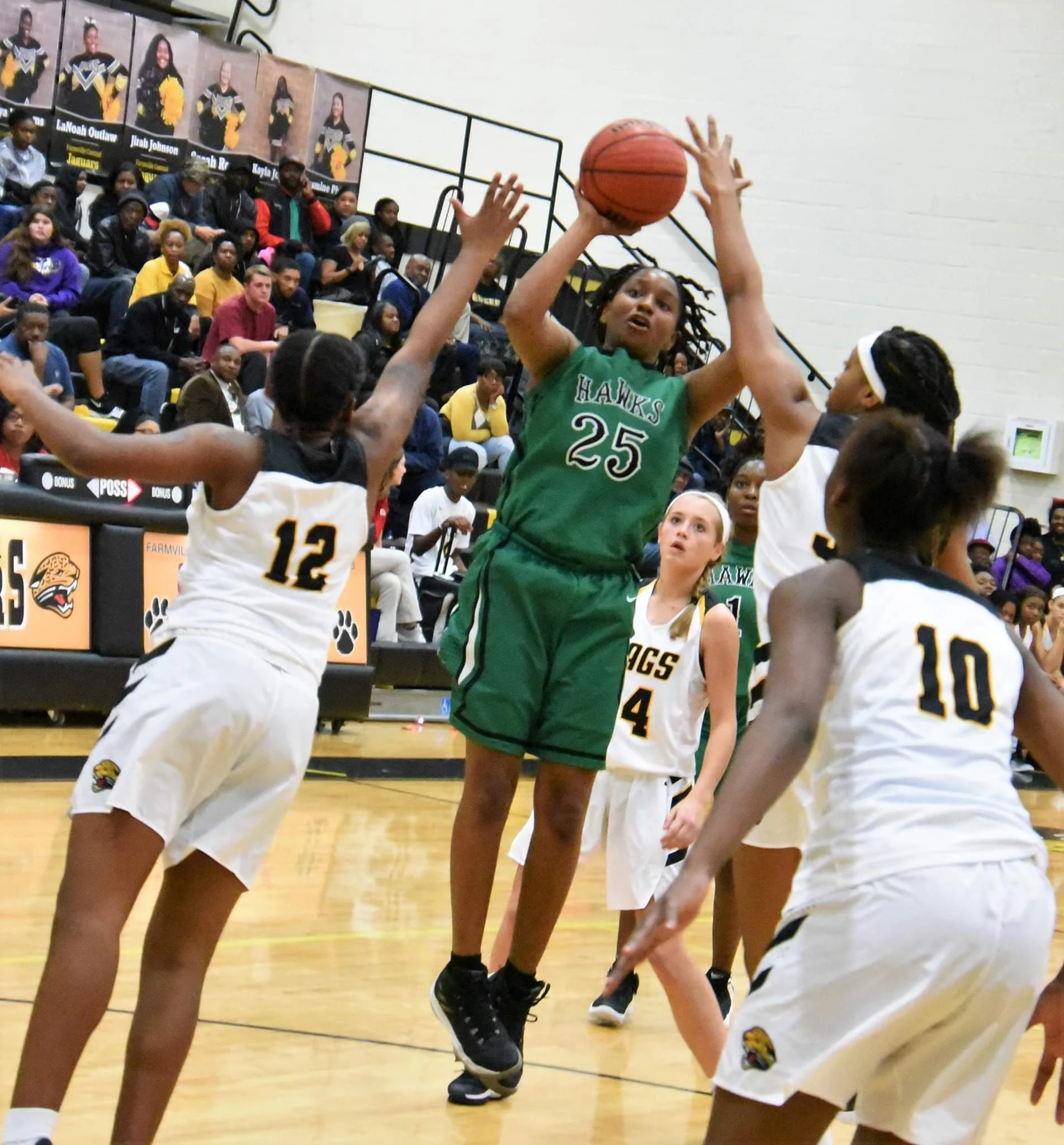 North Lenoir’s Ashanti Lynch shoots under heavy duress against Farmville Central on Dec. 5. The Hawks received a No. 13 seed in the state playoffs. Photo by William ‘Bud’ Hardy / Neuse News