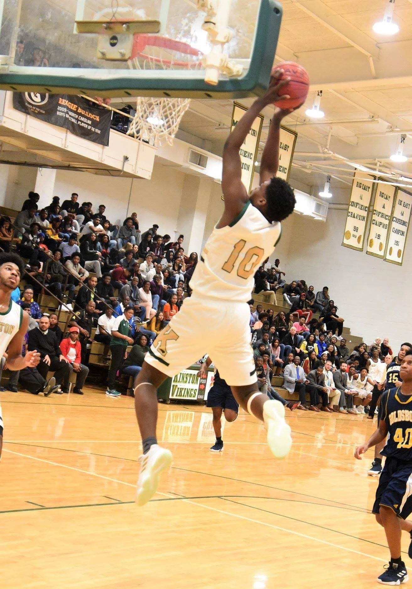 Kinston’s Judah McBynum skies for a basket in Kinston’s game against Goldsboro Dec. 20, 2018. Photo by William “Bud” Hardy