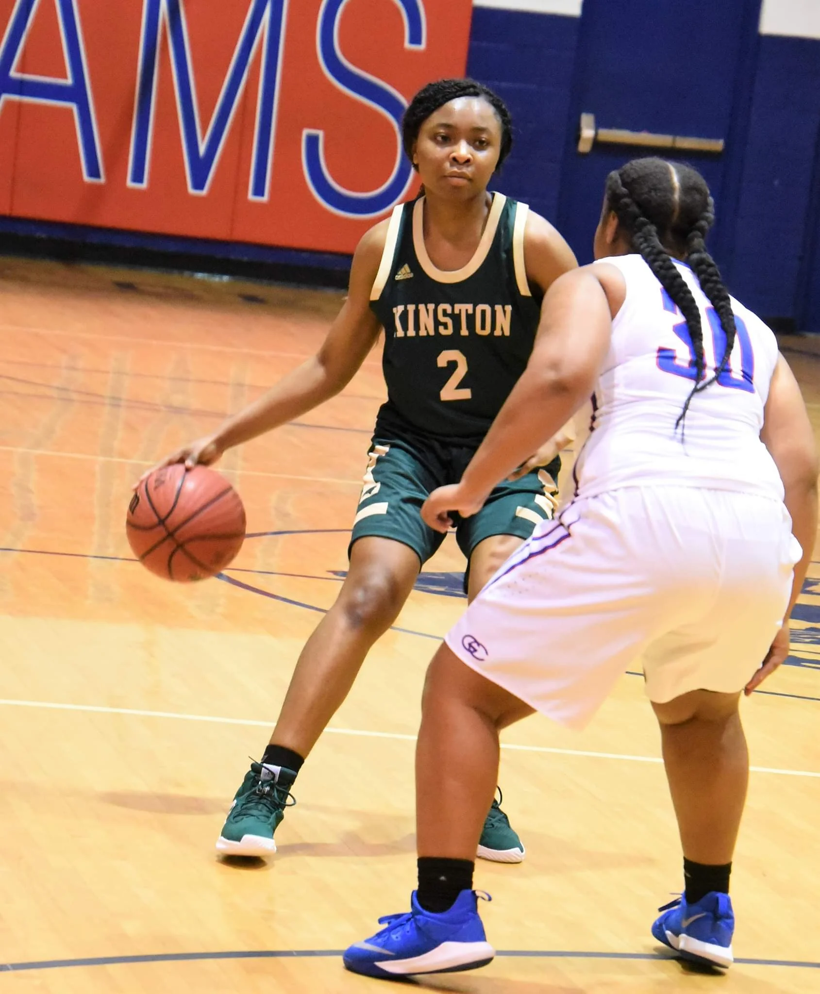 Kinston’s Khalia Hargett looks to make a play while being defended against Greene Central’s Leaudrea Mason during a game on Dec. 14, 2018. Photo by William “Bud” Hardy