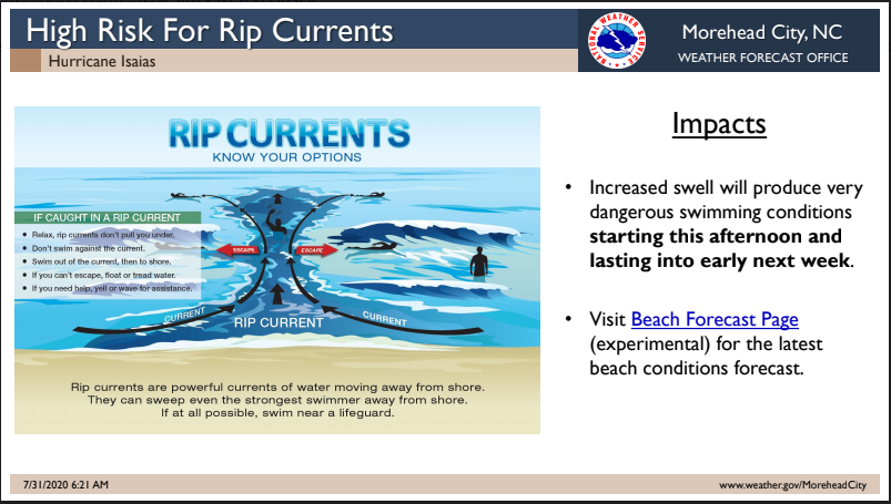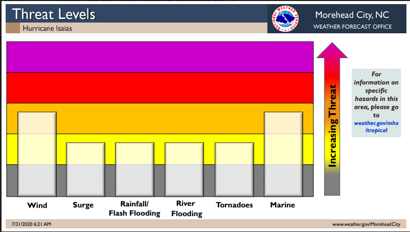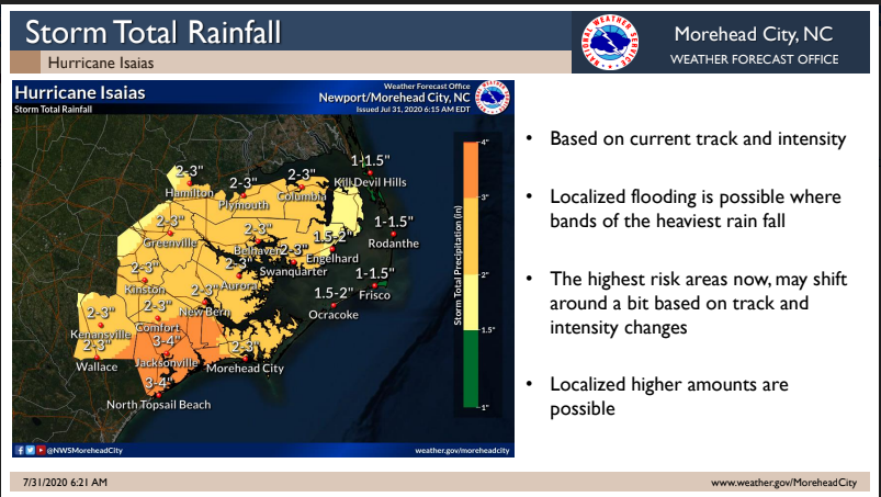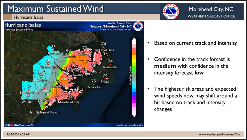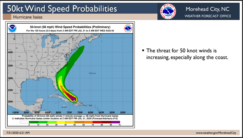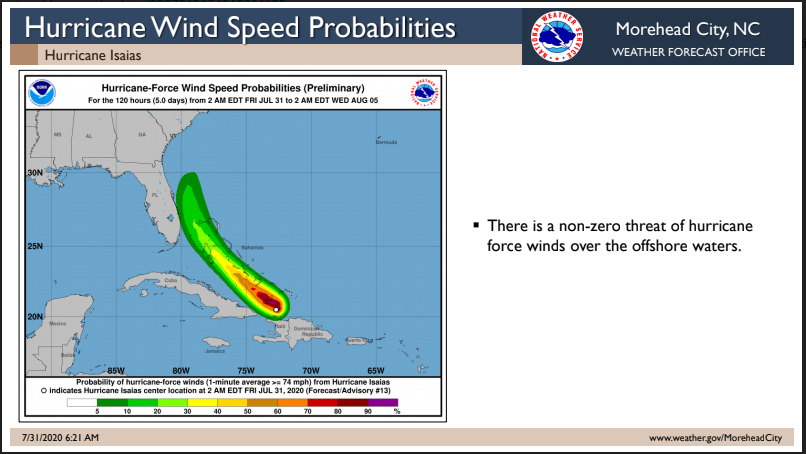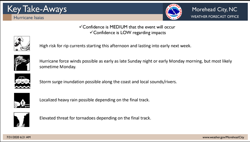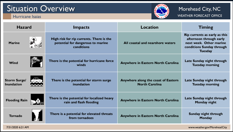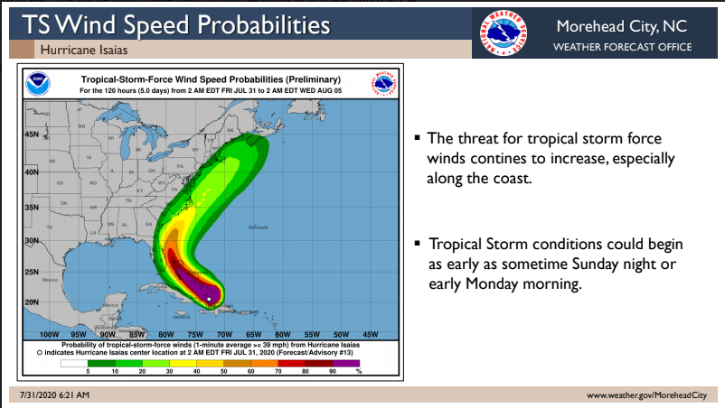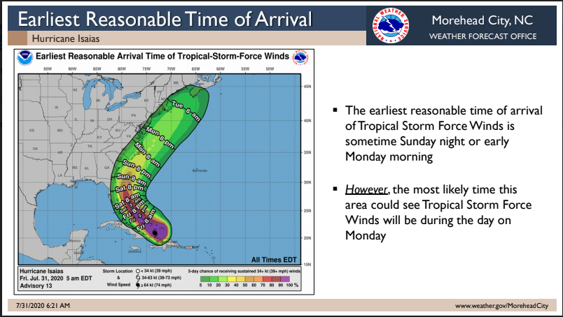 Isaias has strengthened overnight into a hurricane. Attached is our latest briefing. Our confidence has increased that we will be impacted by Isaias, but our confidence still remains low especially with regards to intensity and timing. For timing, please refer to the earliest onset of tropical storm force winds as a reasonable worse case scenario in terms of your planning. The most likely time for the arrival of tropical storm force winds is still sometime during the day Monday.