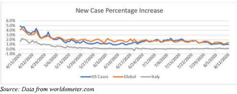 Overall, the pandemic has been brought back under control at the national level, and we’re seeing significant drops in case growth in many states. The good news here is that policy and behavioral changes are taking effect, as they did in the first wave, and we have largely contained the virus as we did then. The risk of a national shutdown is now quite small. Looking forward, the pandemic seems to have stabilized at the same growth rate as we saw in mid-June, albeit the higher number of cases means the daily new case growth remains higher.