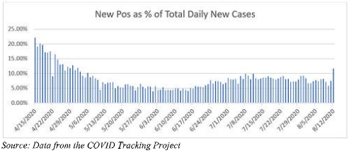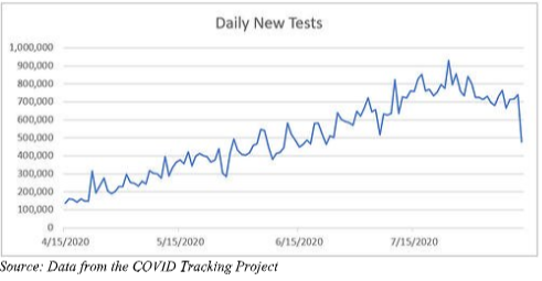 If this holds, the pandemic will have come under control again, albeit at a higher infection level than we saw six weeks ago. This is a significant improvement over mid-July. The testing news is more mixed. The number of tests has trended down over the past two weeks, from more than 800,000 per day to around 700,000 per day in the past week, with the most recent testing day dropping even further. The decline in tests has not been because of a slowdown in infections, as the positive rate has held at between 7 percent and 8 percent, with a recent spike above that level. This is a metric that will need to improve to keep the virus under control, and the recent data is moving in the wrong direction. Beyond the headline numbers, state-level data is generally good but with some worrying signs.