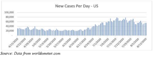 New cases per day. The most obvious metric for tracking the virus is daily new cases. With increased control measures in place, especially in the outbreak states, the number of new cases per day has dropped from the recent high of more than 70,000 per day down to around 55,000 per day, and it has been steady for the past couple of weeks. The new case growth comes from a wide range of states now, although the worst hit have now peaked.