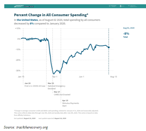 Case growth in California remains high, but most of the worst affected states (including Florida and Texas) appear to have peaked, as people and governments there have started to reimpose social distancing and other restrictions. Plus, Georgia is stabilizing. These changes show that policy measures are constraining further increases. Overall, the national risks remain under control. With the medical news better, the economic recovery remains on track. The job market continues to improve, although signs of a slowdown in spending are something to keep an eye on.