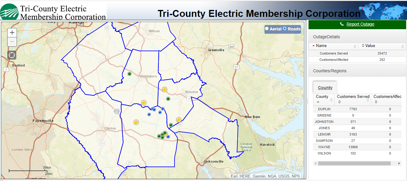 “We had about 1,450 members without power at the peak of the storm on our total system with about 400 in Wayne County. At this time we have 433 outages total and 31 in Wayne County. We have a problem with our outage map and it’s not showing outages per county but we are working on it. Crews were out by 5:30 am working to restore services. We should have all power restored by noon today,” said Robert B. Kornegay, Manager of Member Services Tri-County EMC.