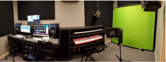 The Digital Media Lab gives our users access to the necessary software and tools for all digital media creation such as video editing/recording equipment, including a greenscreen, professional lighting, audio equipment for recording/mixing music, including high quality microphones, musical instruments, and recording/mixing software, along with the software to create 2D animations, 3D animations, and much more. On top of that, two monitor workstations completed with iMac 27 with intel processor, and a high graphic performance Windows 10 PC are available for users to do professional quality editing and processing.