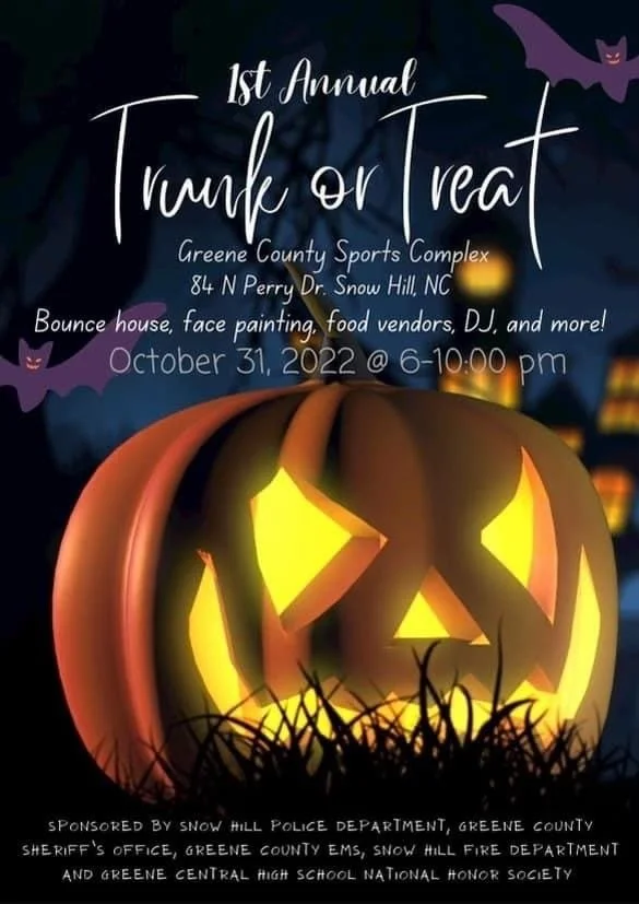 A Trunk or Treat will be held at the Greene County Sports Complex, at 84 N. Perry Drive in Snow Hill on Monday, October 31st, from 6:00 pm until 10:00 pm. This event is sponsored by Snow Hill Police Department, Greene County Sheriff's Office, Greene County EMS, Snow Hill Fire Department and Greene Central High School National Honor Society.