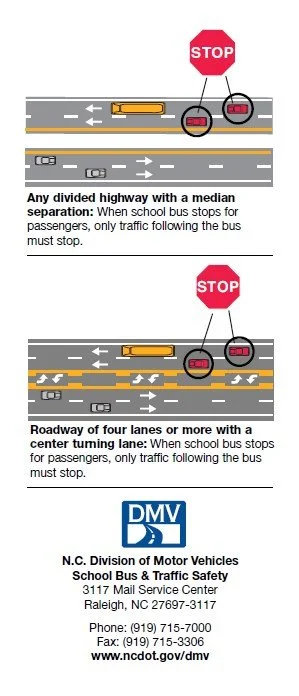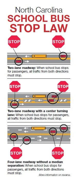 Rental car companies must display notification of NC school bus stop arm law in English, French, German, Japanese, and Spanish