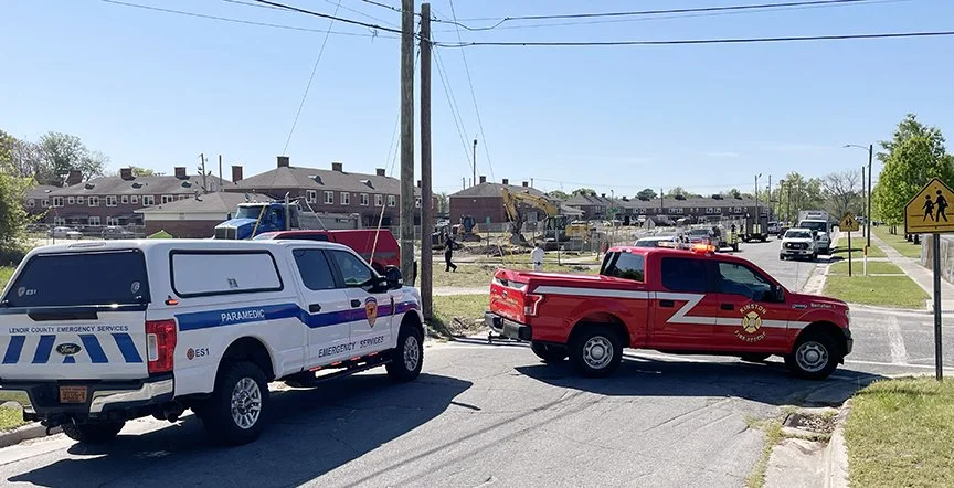 Lenoir County Emergency Services is on scene assisting Kinston Department of Fire & Rescue with a major gas leak at the corner of East King St and South McDaniels St in Kinston.