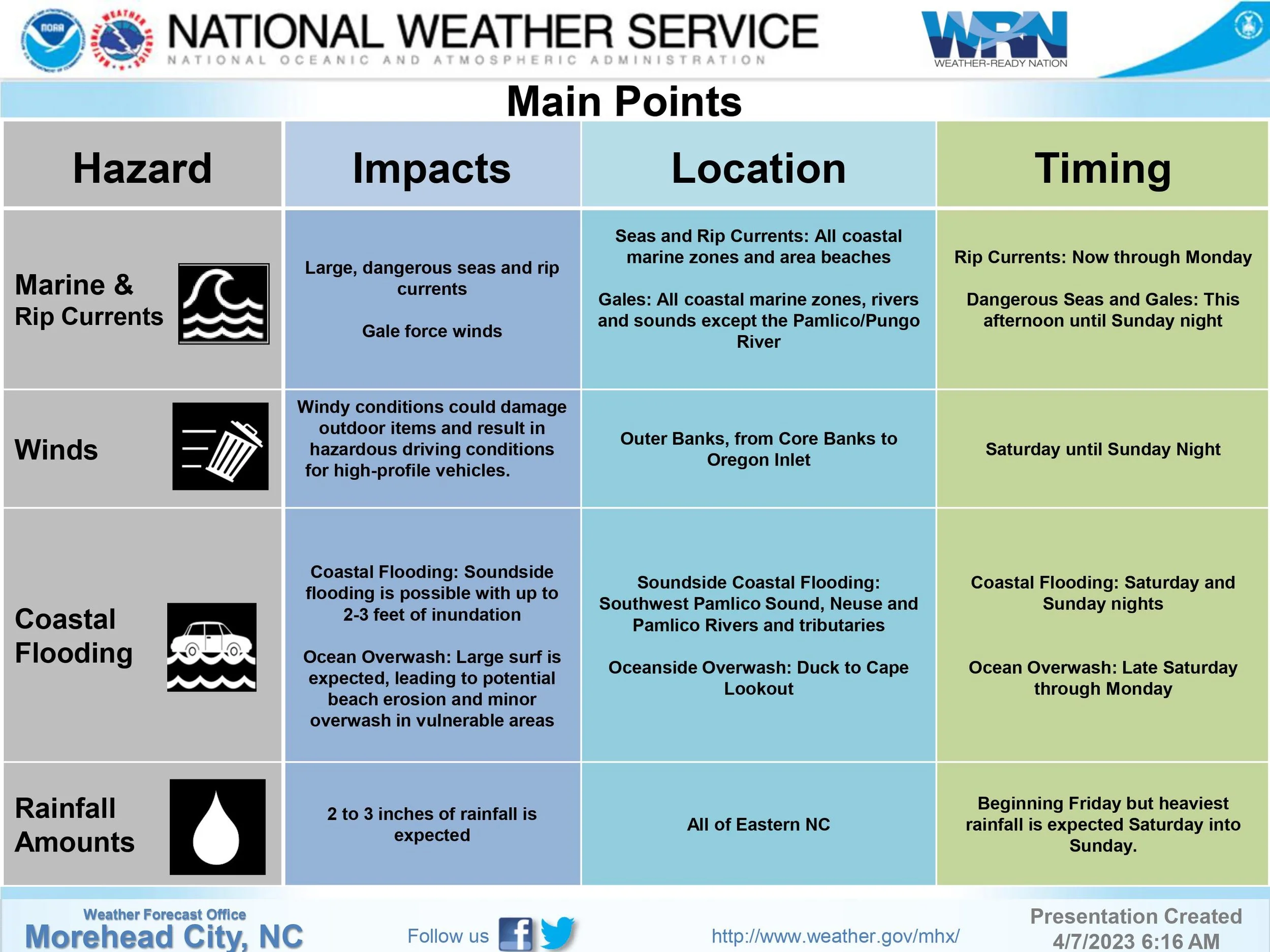 A coastal storm is expected to impact eastern North Carolina this weekend, with highest impacts along the coast. Most significant impacts will be potential soundside coastal flooding, ocean overwash, and high winds over area waters and the Outer Banks.