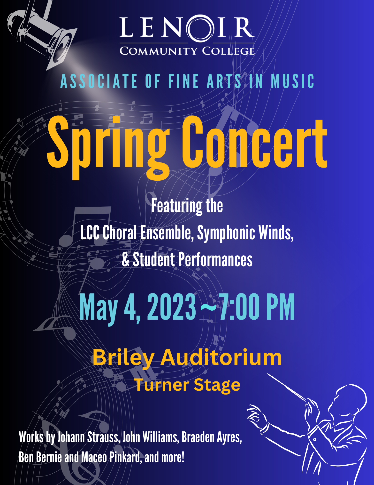 Lenoir Community College is presenting the Associate in Fine Arts Annual Spring Concert at 7 p.m. Thursday, May 4 in the Briley Auditorium on the Turner Stage. The performance is open to the public, and the show will comprise student performances, the LCC Choral Ensemble, and the Symphonic Winds.