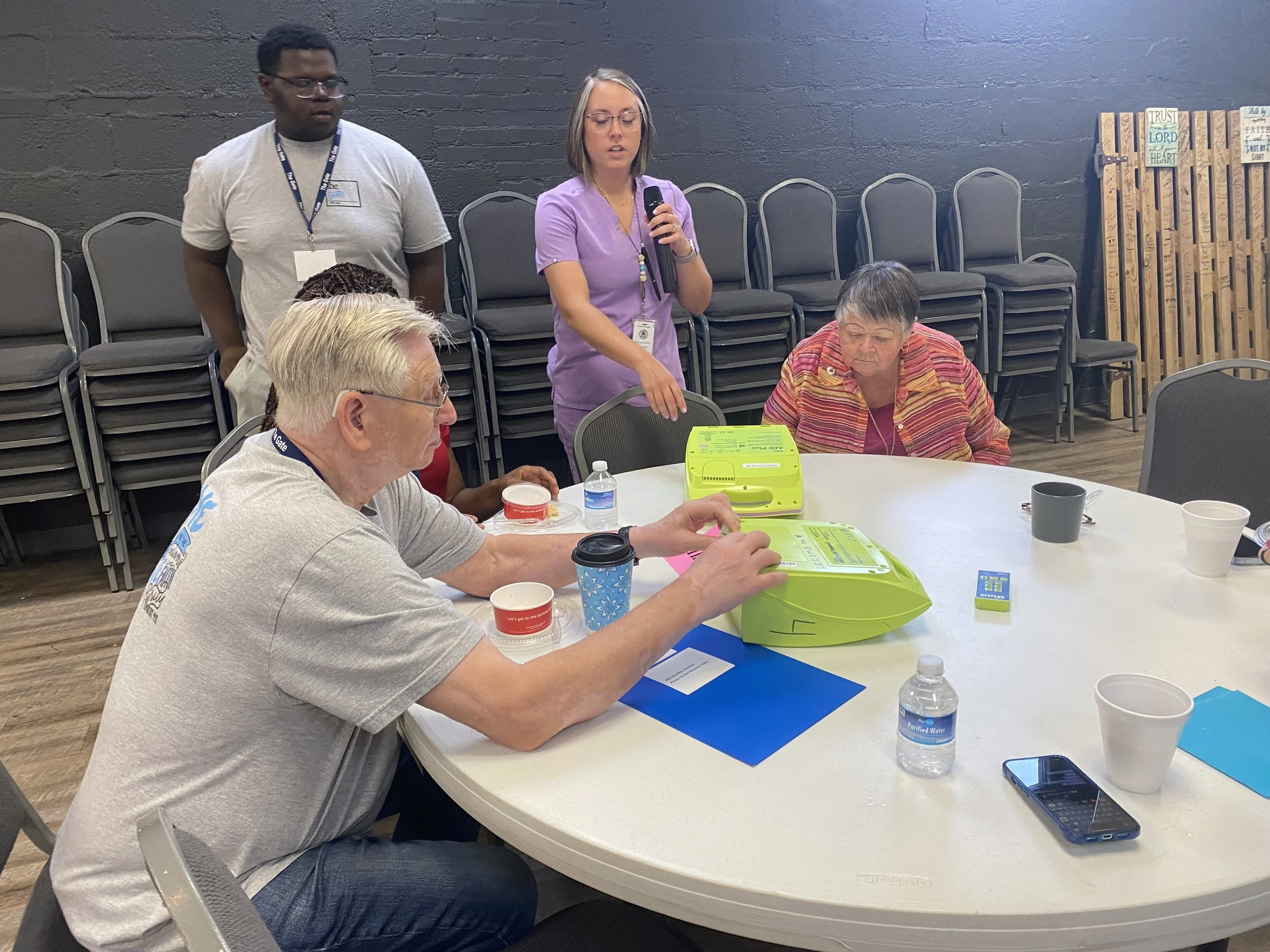 The following morning after the city council meeting, The Gate organized a breakfast training session. The City of Kinston Employee Nurse Blake Burkett gave training to members of the Gate and the Kinston/Lenoir Parks and Recreation department on how to set up and use the AEDs that will be on-site at every park and recreation facility.