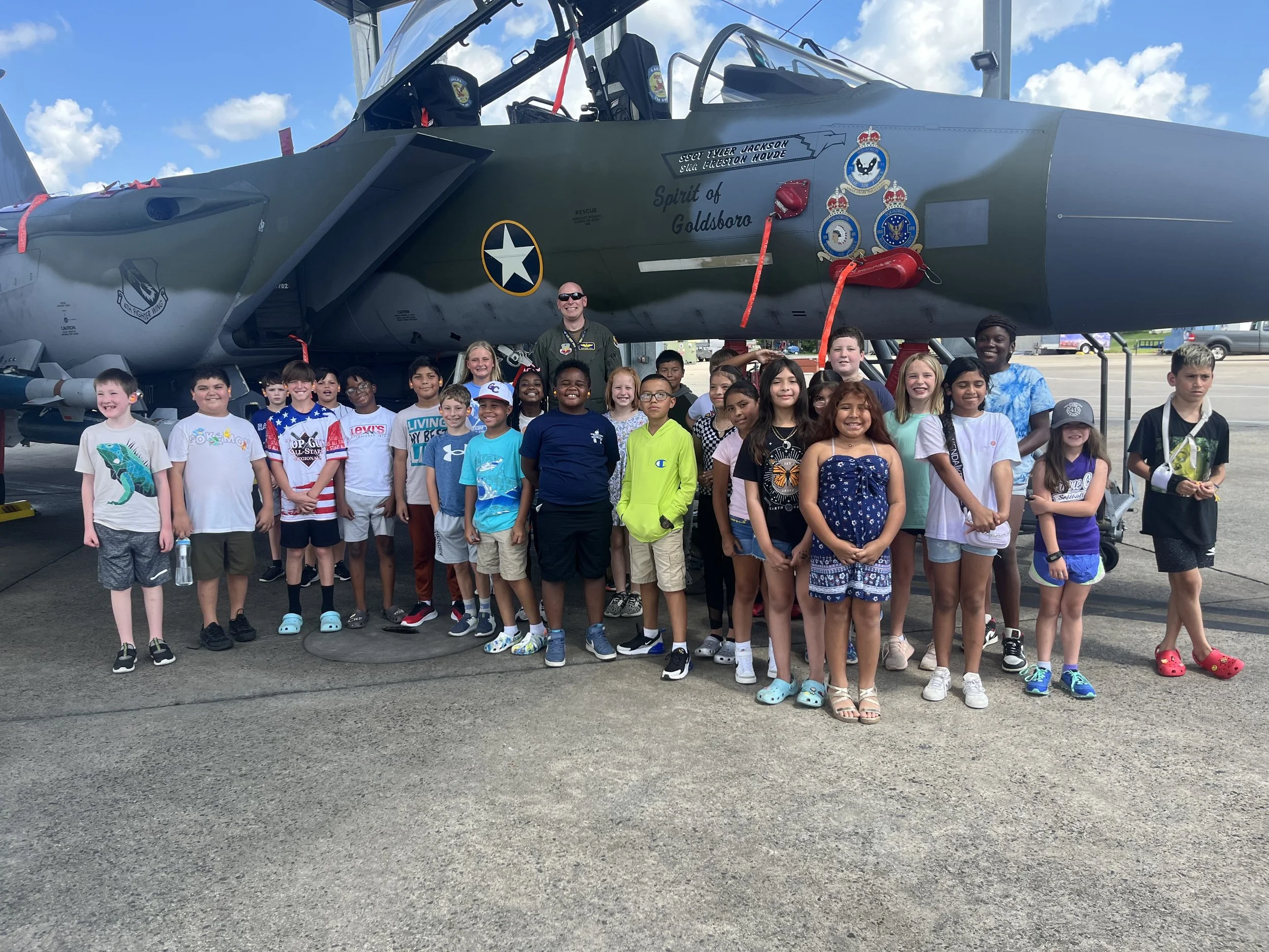 At Seymour Johnson, students were taken around the base by Major Kyle Eich, an air force pilot. He gave a brief presentation to the students about the various careers and opportunities in the Air Force and the equipment that they use. The campers then toward the tarmac to get an up-close look at F-15s. Students were also able to sit in the cockpit so they could get a first-hand look at the controls of the fighter jet.