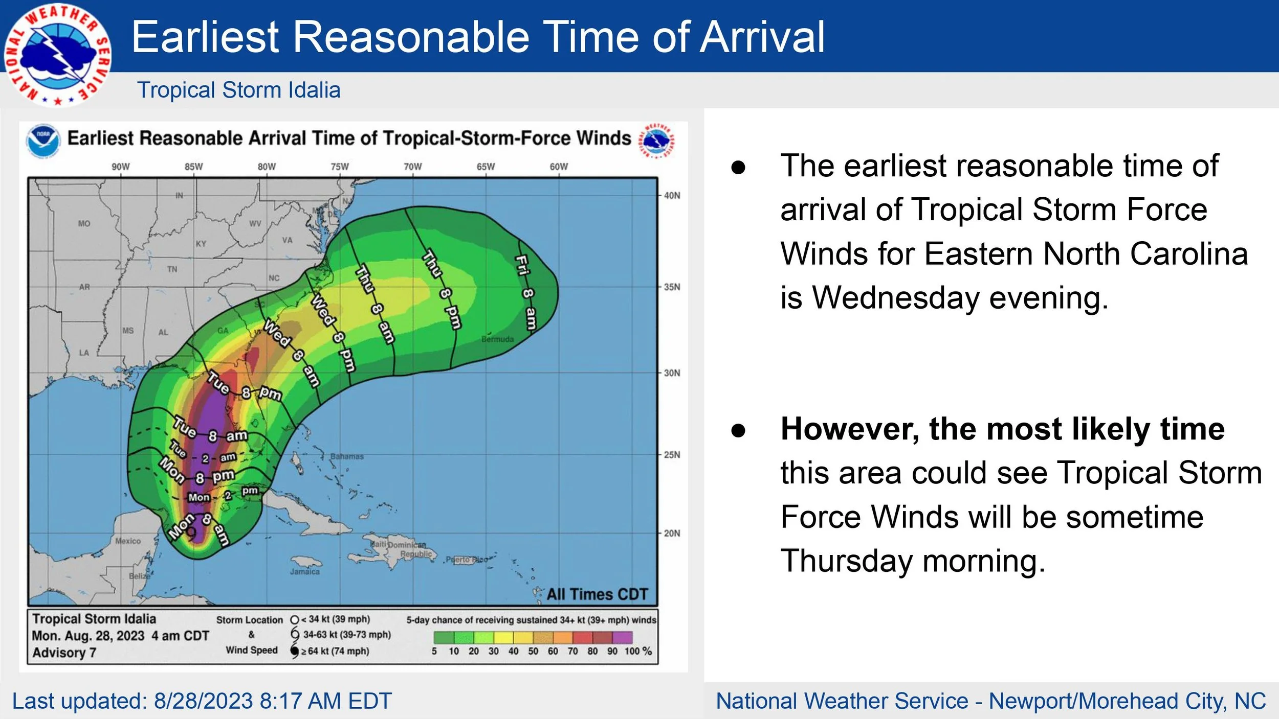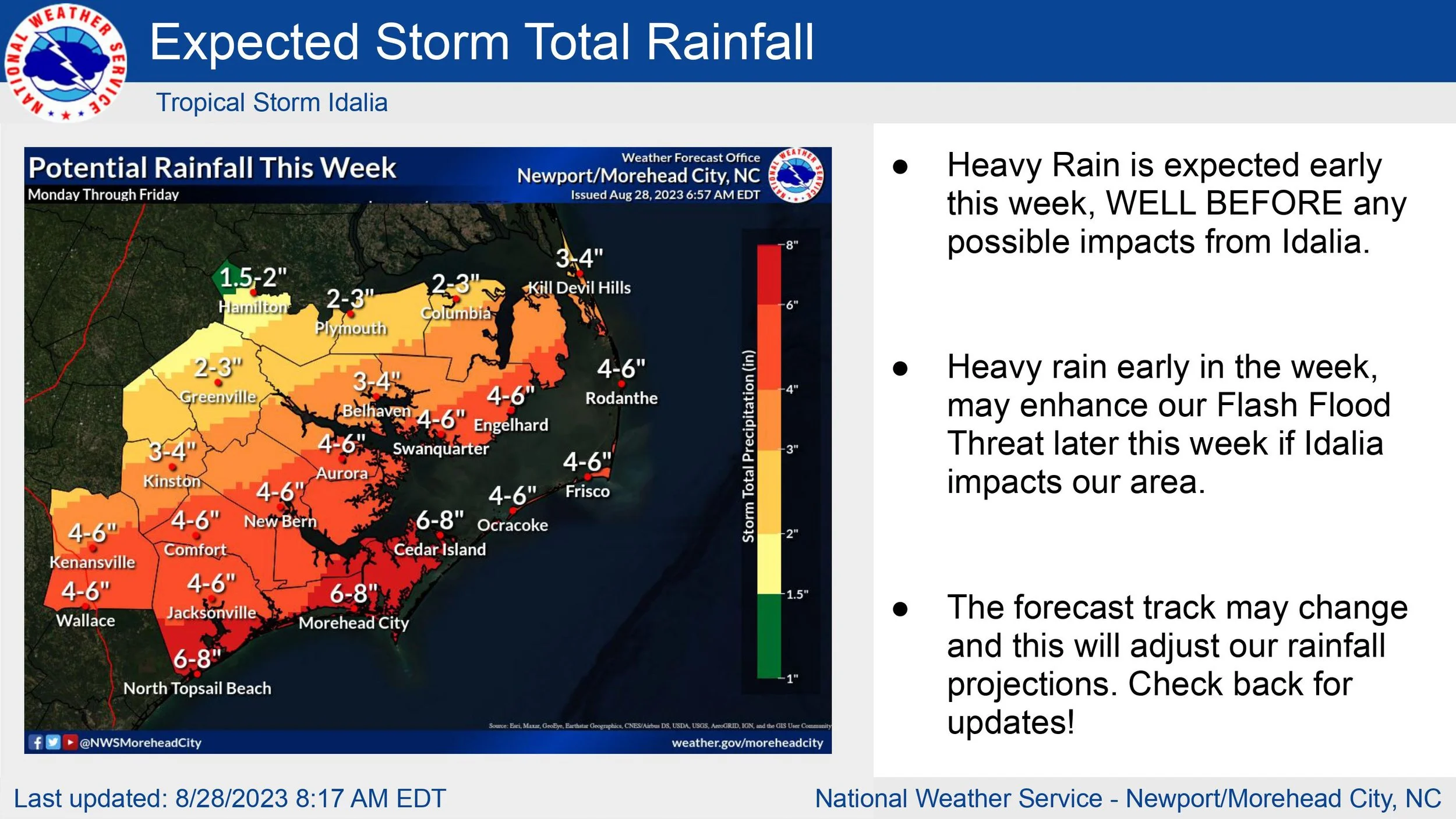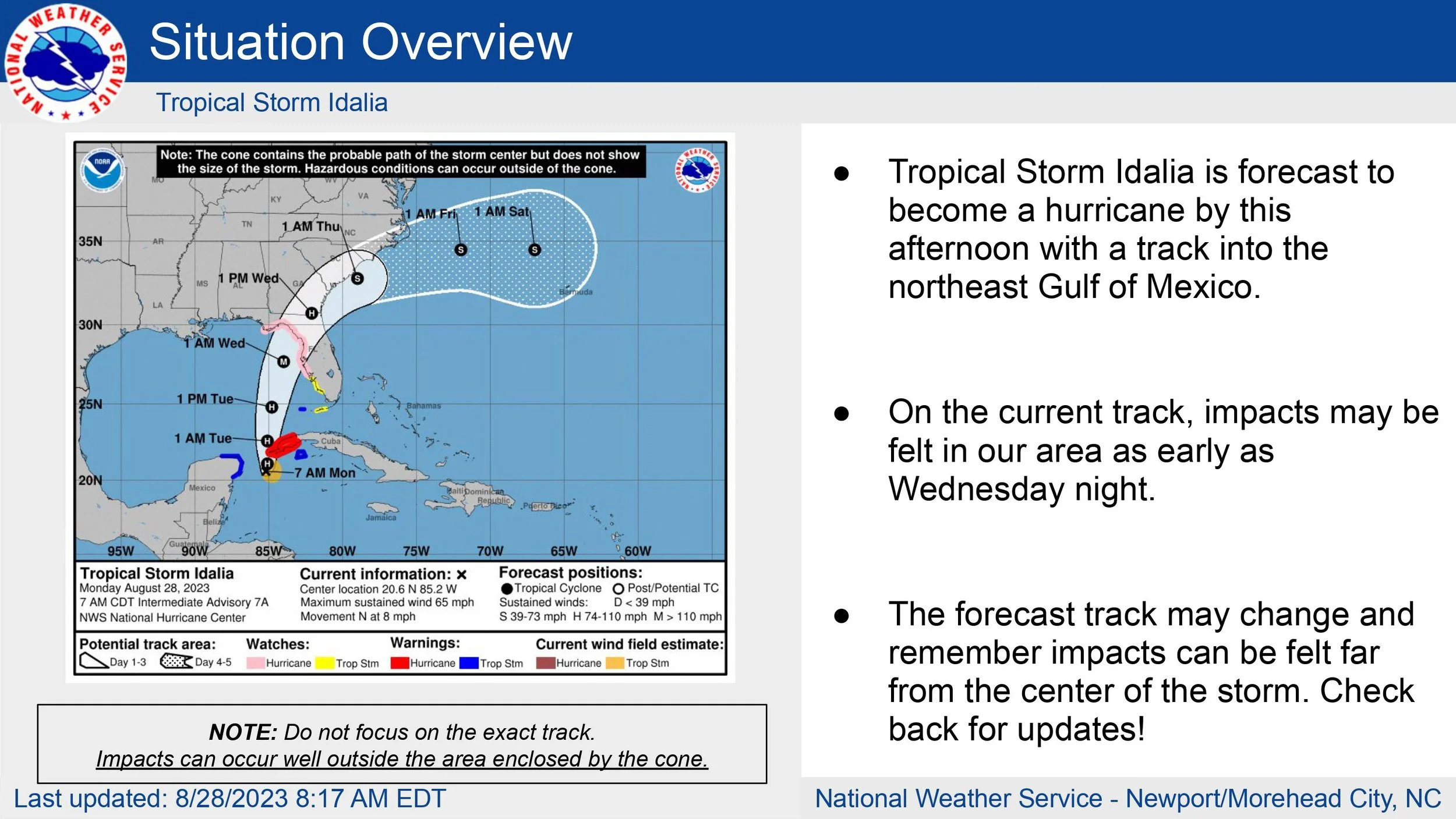 Impacts to eastern NC from Tropical Storm Idalia look to be increasing mid-to-late week, but the extent of any impacts is uncertain at this point and largely track and intensity dependent. Please see the attached multiple page briefing for more information.