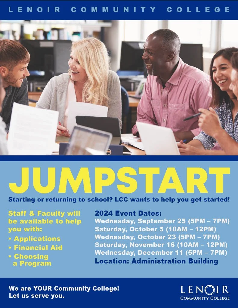 Jumpstart your future at Lenoir Community College! LCC is hosting Jumpstart events throughout the fall to help students who are starting or returning to school get started on their educational journey. Jumpstart events are designed to guide students through the application process, financial aid, and choosing the right program. LCC’s dedicated staff and faculty will be on hand to support students in making their educational goals a reality.