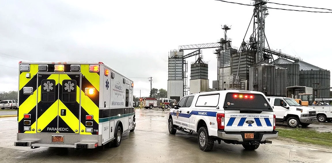 The volunteer fire departments of Deep Run, Pink Hill, Southwood and Sandy Bottom are on the scene of a working grain bin fire on Live Oak Hog Co Road in Deep Run. Multiple firefighters are actively working to extinguish the fire which started inside one of the grain towers.