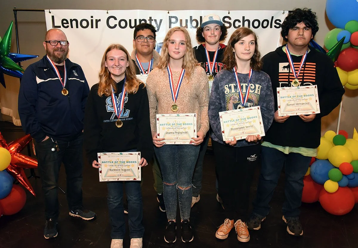 South Lenoir High's winning Battle of the Books team are, from left, front, Kadence Thigpen, Joanna Prybylinski and Rosealynne Terrio; back, coach Ryan Gardner, Jose Avalos Gonzalez, Michael Mozingo and Samuel Hernandez.