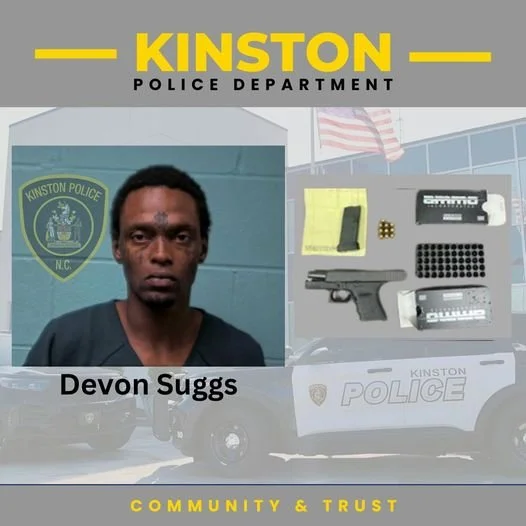 KPD's B-Squad responded to a shots fired call in the area of 800 Airport Road. As officers approached the area, they heard several shots close to their location. Officers observed Devon Suggs (28 of Kinston) walking from a wooded area the shots came from. Suggs was in possession the of the firearm and he was taken into custody for discharging a firearm in the city limits. Officers seized his firearm and collected over 40 shell casings. They also discovered Suggs had purchased the firearm early that day.
