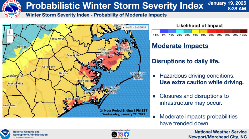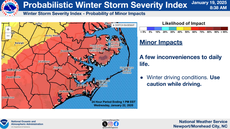 Forecast confidence is high that we will see some accumulating snow for portions of Eastern NC Tuesday evening into early Wednesday. Specific details like how much dry air will be in place to inhibit heavier snow totals are still uncertain and therefore it is still too early to project snowfall amounts (see probability slides for your area). As confidence continues to increase on forecast amounts, we should have our first snowfall projection later today.