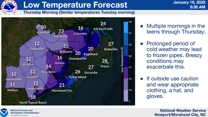 Also, extremely cold weather will impact our area starting Monday night, and lasting through Thursday, where morning lows will be in the teens and wind chills in the single digits at times. Prolonged cold may cause issues with pipes and other sensitive infrastructure and if snow falls, it may linger for several days due to the extreme cold.