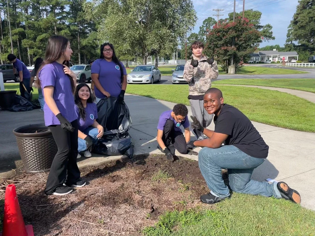 Yaritza Acevedo, Monica Acevedo, Alayna Casias, Jason Pike, Jordan Combs, and Joshua Witherspoon are participating in community service by cleaning up school grounds at Greene Early College.