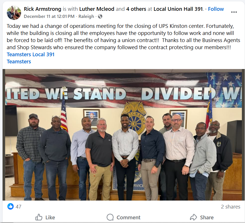 The UPS facility in Kinston will permanently close on Jan. 12, according to Teamsters Local 391.