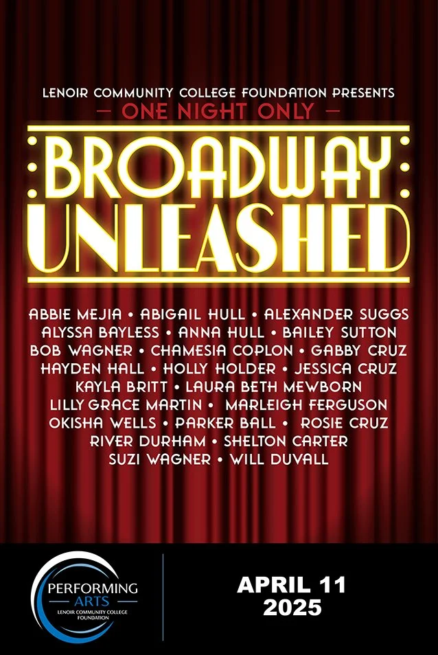 Lenoir Community College invites the community to an evening of music and magic at Broadway Unleashed, a one-night-only musical extravaganza on Friday, April 11 at 7:00 PM. Talented performers from across the area will take the stage to bring your favorite Broadway hits to life!