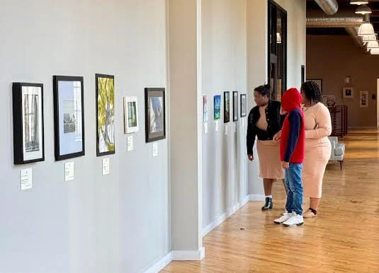 [A participant and her family view the 2025 Congressional Art Competition 1st Congressional District pieces on display in Rocky Mount Mills]