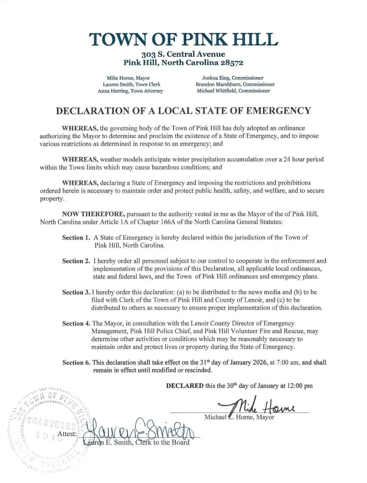 Jan 30 Jan 30 Pink Hill declares State of Emergency ahead of significant winter storm Neuse News Local News Leave a comment
