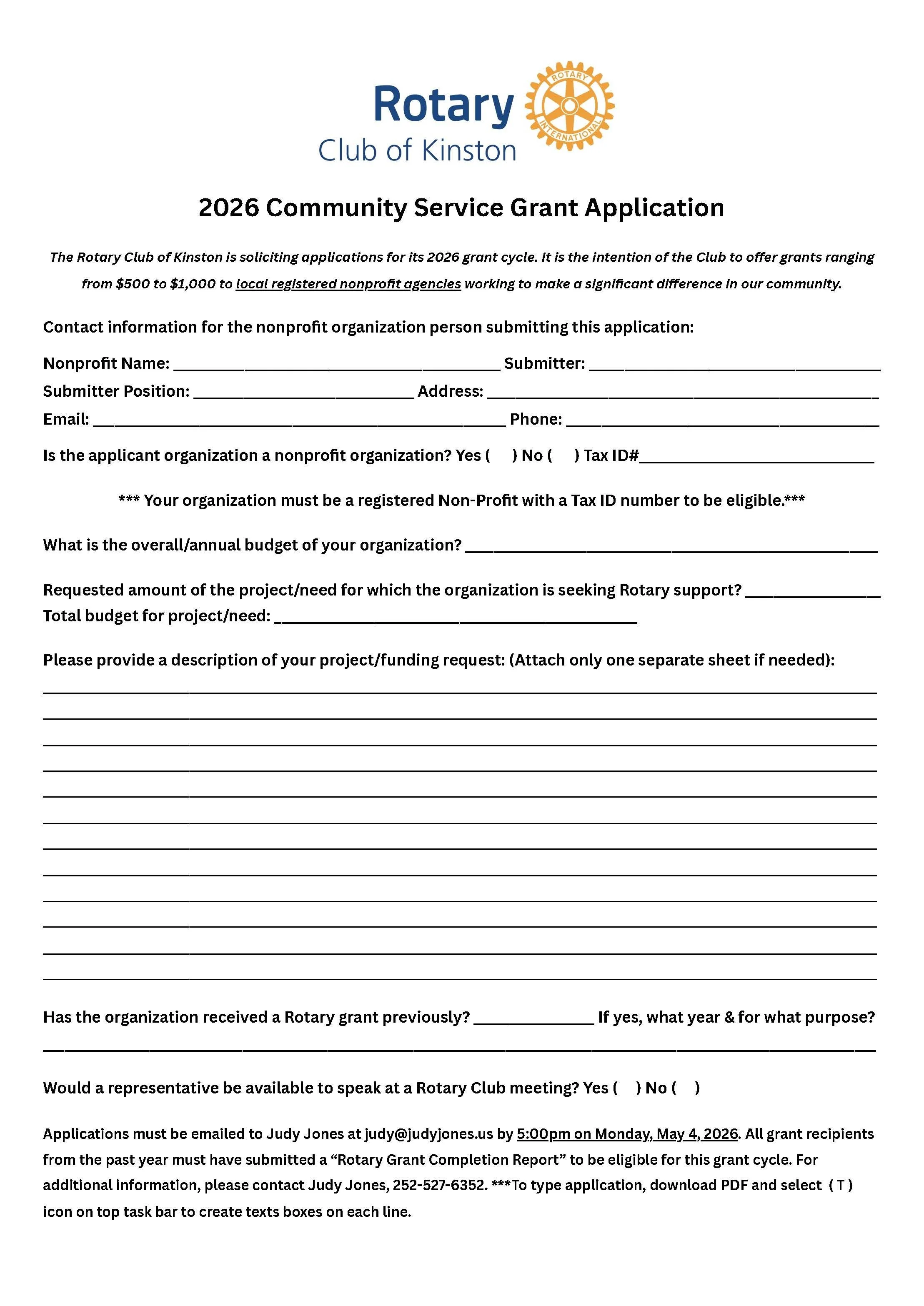 The Rotary Club of Kinston is excited to announce that we are now accepting applications for our Community Service Grant Program for 2026.