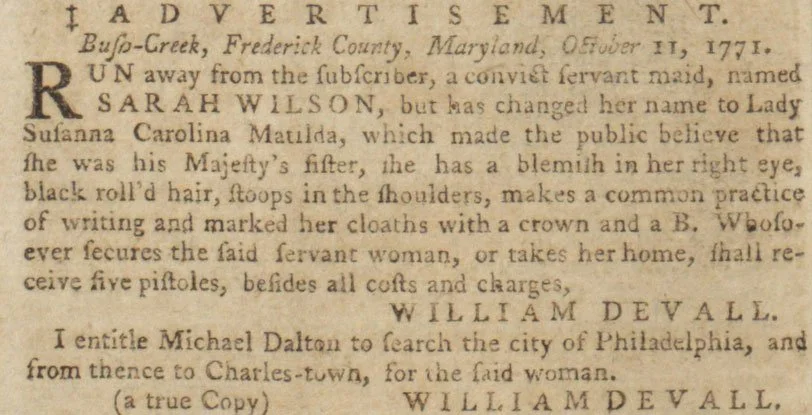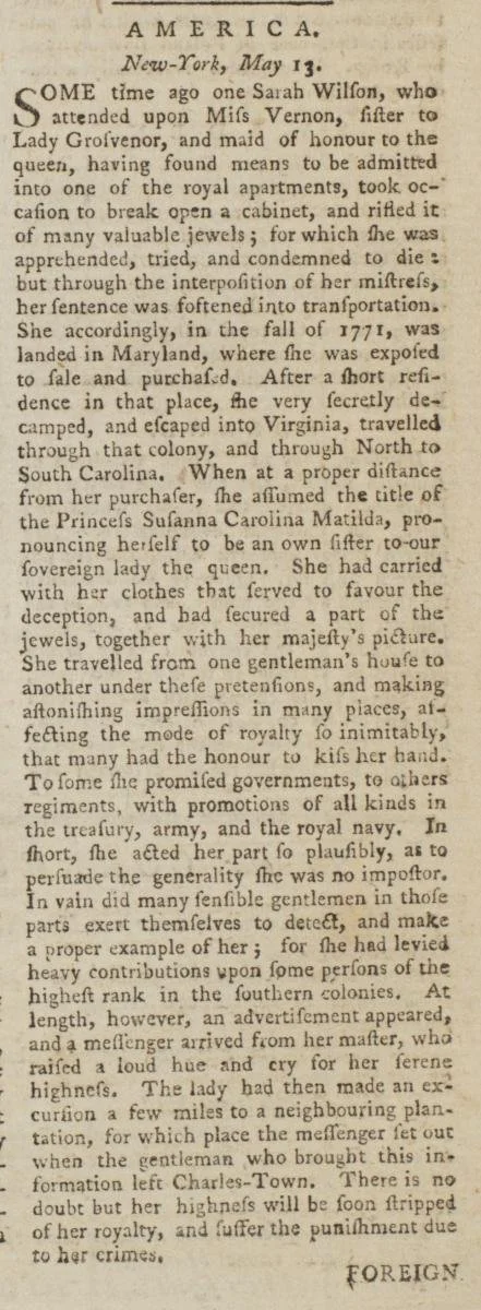 Soon after, newspaper reports began circulating through the colonies. The "royal sister" was not royal at all. Her real name was Sarah Wilson, a former servant in the queen's household. She had been accused of theft in England and sent to America as an indentured servant. From there, she escaped and began traveling from colony to colony, reinventing herself as royalty. She was clever, bold, and always one step ahead of capture.