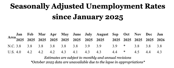 Raleigh, N.C. -— The state’s seasonally adjusted January 2026 unemployment rate was 3.8 percent, unchanged from December’s revised rate. The national rate decreased 0.1 of a percentage point to 4.3 percent.